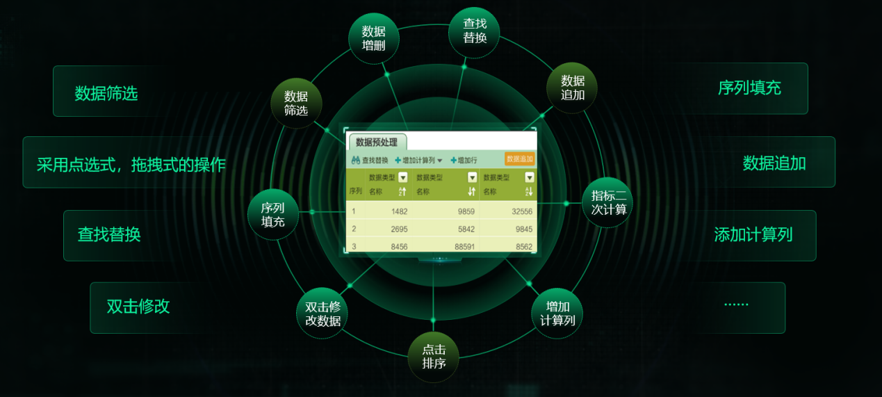 對于接入系統(tǒng)的數(shù)據(jù),通過點選式的方式進(jìn)行去除重復(fù)行、空值替換、數(shù)據(jù)裁剪、數(shù)據(jù)脫敏、類型轉(zhuǎn)換等復(fù)雜的數(shù)據(jù)處理操作,并且能進(jìn)行圖形化界面多表關(guān)聯(lián)。